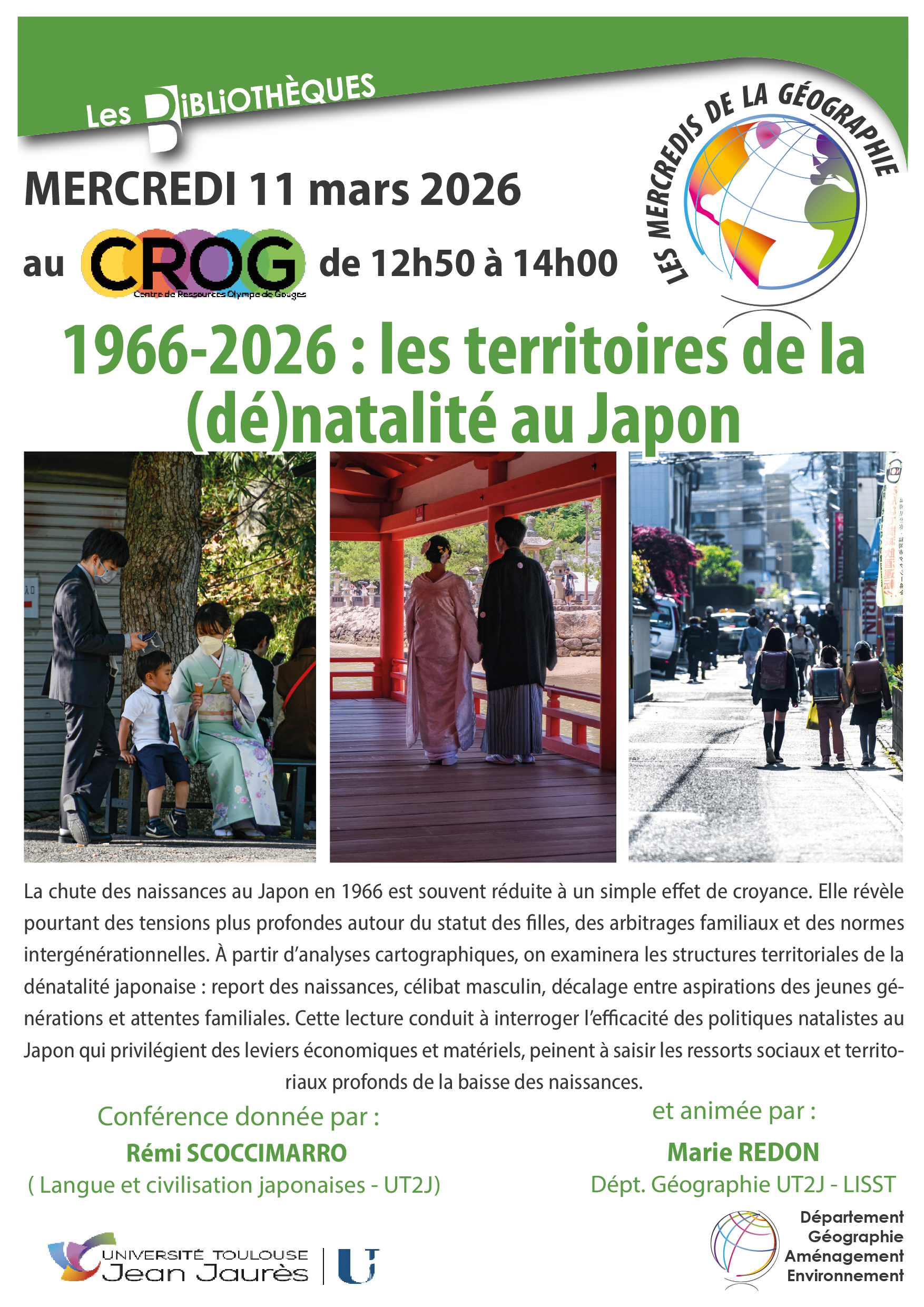 La chute des naissances au Japon en 1966 est souvent réduite à un simple effet de croyance. Elle révèle pourtant des tensions plus profondes autour du statut des filles, des arbitrages familiaux et des normes intergénérationnelles. À partir d'analyses cartographiques, on examinera les structures territoriales de la dénatalité japonaise : report des naissances, célibat masculin, décalage entre aspirations des jeunes générations et attentes familiales. Cette lecture conduit à interroger l'efficacité des politiques natalistes au Japon qui privilégient des leviers économiques et matériels, peinent à saisir les ressorts sociaux et territoriaux profonds de la baisse des naissances.