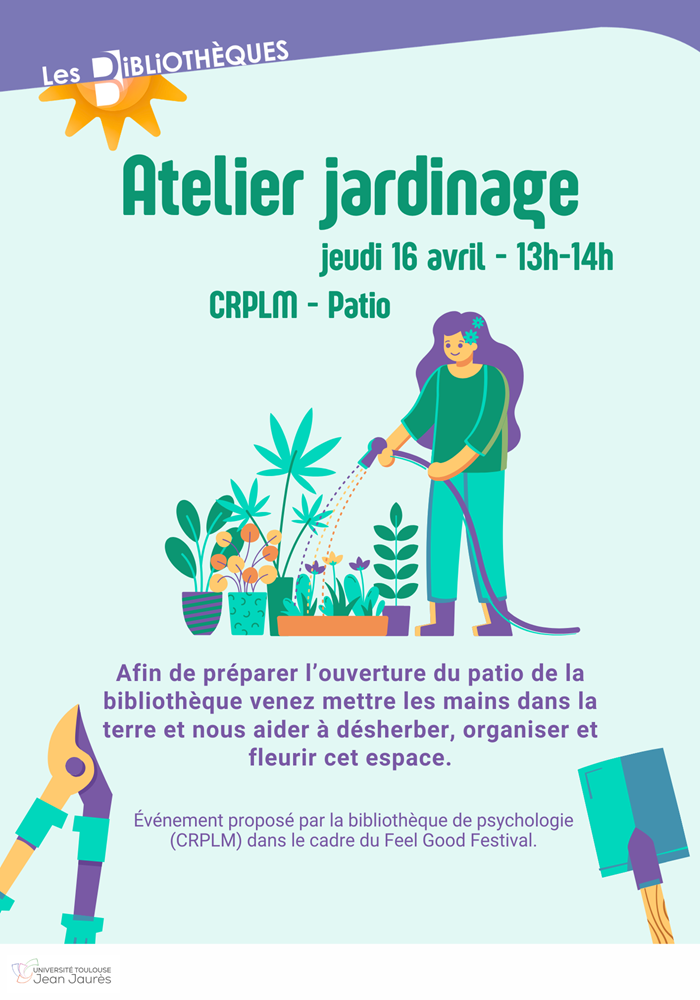 Dans le cadre des deux semaines du Feel Good Festival, le Centre de ressources de psychologie Louise Michel (CRPLM) vous convie le jeudi 16 avril de 13h à 14h à participer à un atelier jardinage. Cet atelier est ouvert à tous (étudiants et personnels).