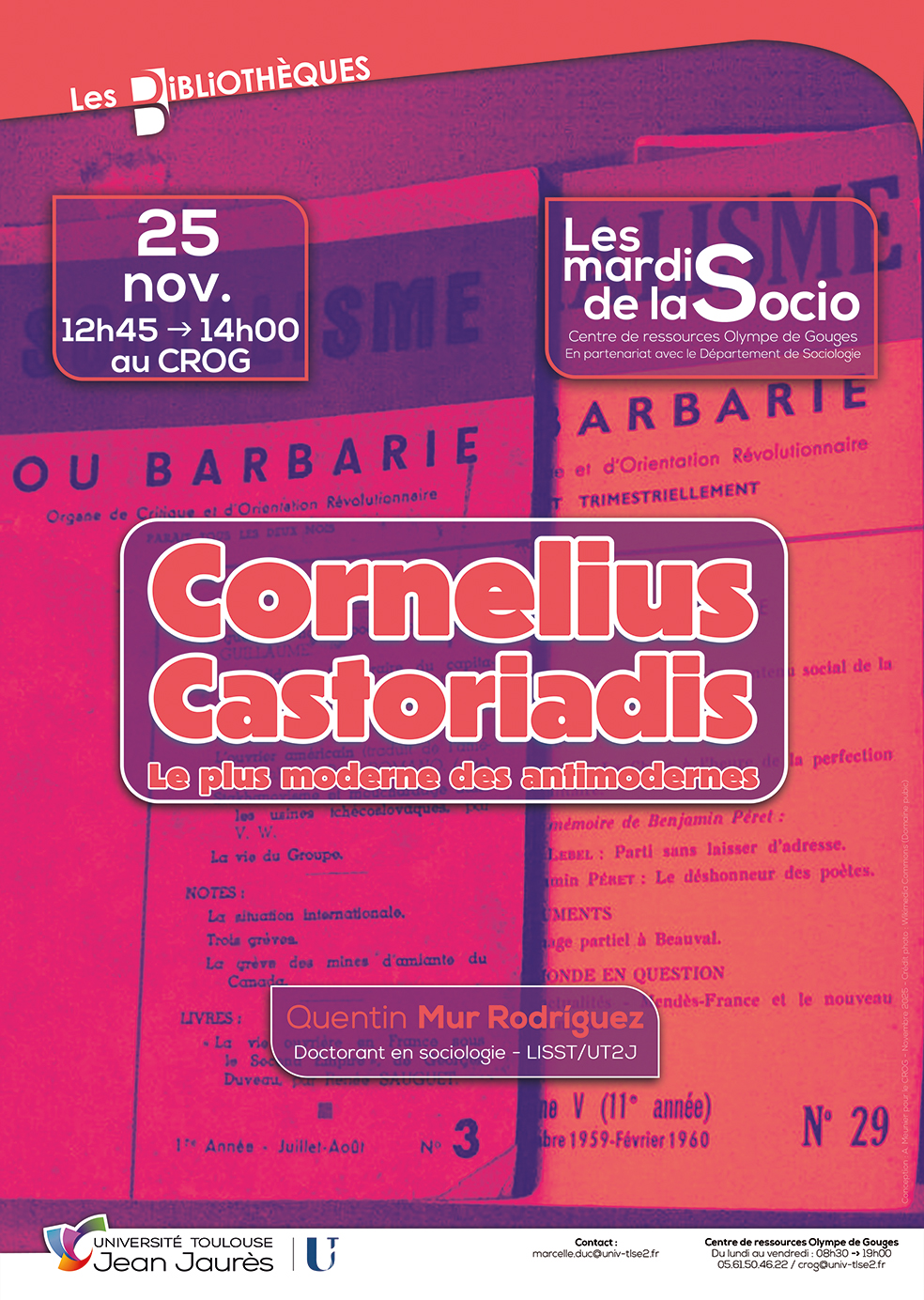 Dans le cadre de cette intervention, Quentin Mur Rodríguez, doctorant en sociologie (laboratoire LISST UT2J) s'intéressera à la figure assez méconnue de Cornelius Castoriadis. Fondateur du groupe Socialisme ou barbarie, aussi bien sociologue, psychanalyste que philosophe, le penseur d'origine grecque n'a eu de cesse de critiquer la modernité au nom d'un projet d'autonomie. Quentin Mur Rodríguez tentera ici de souligner les tensions d'une telle entreprise.