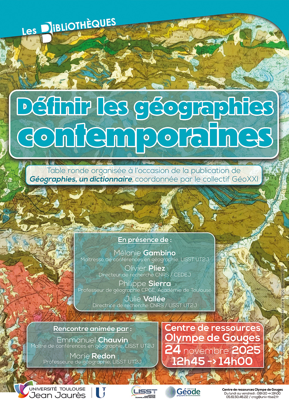 A l'occasion de l'édition de Géographies, un dictionnaire coordonnée par le collectif GéoXXI, une table ronde est organisée au CROG pour présenter les enjeux de cette publication qui regroupe 261 auteurs, dont 16 du site toulousain.