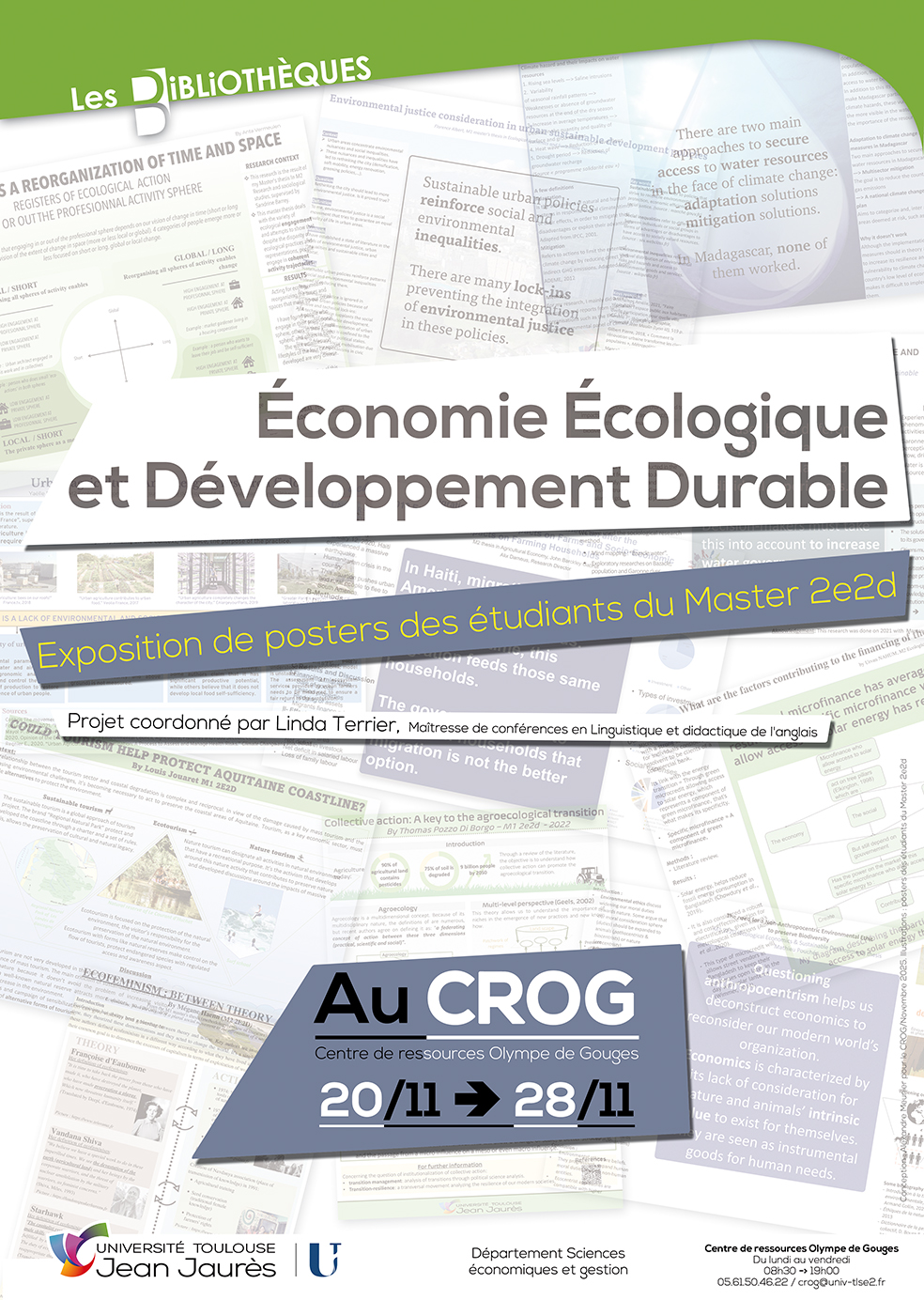 Les étudiant·es de deuxième année du Master « Économie écologique et développement durable » présentent une exposition unique organisée au Centre de ressources Olympe de Gouges (CROG) et au Centre de Ressources des langues (CRL) Langues, avec des posters scientifiques en anglais issus des mémoires de Master 1 des étudiant·es.