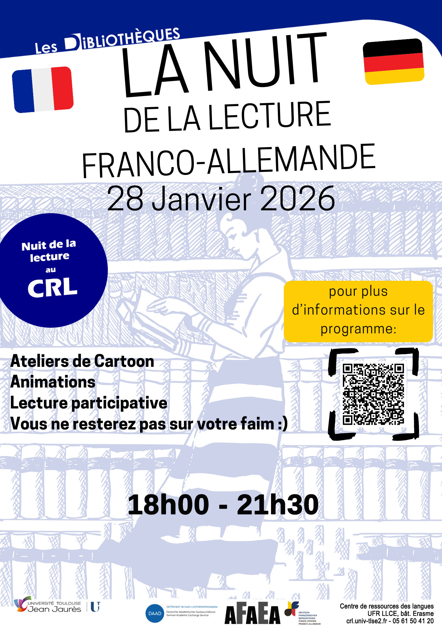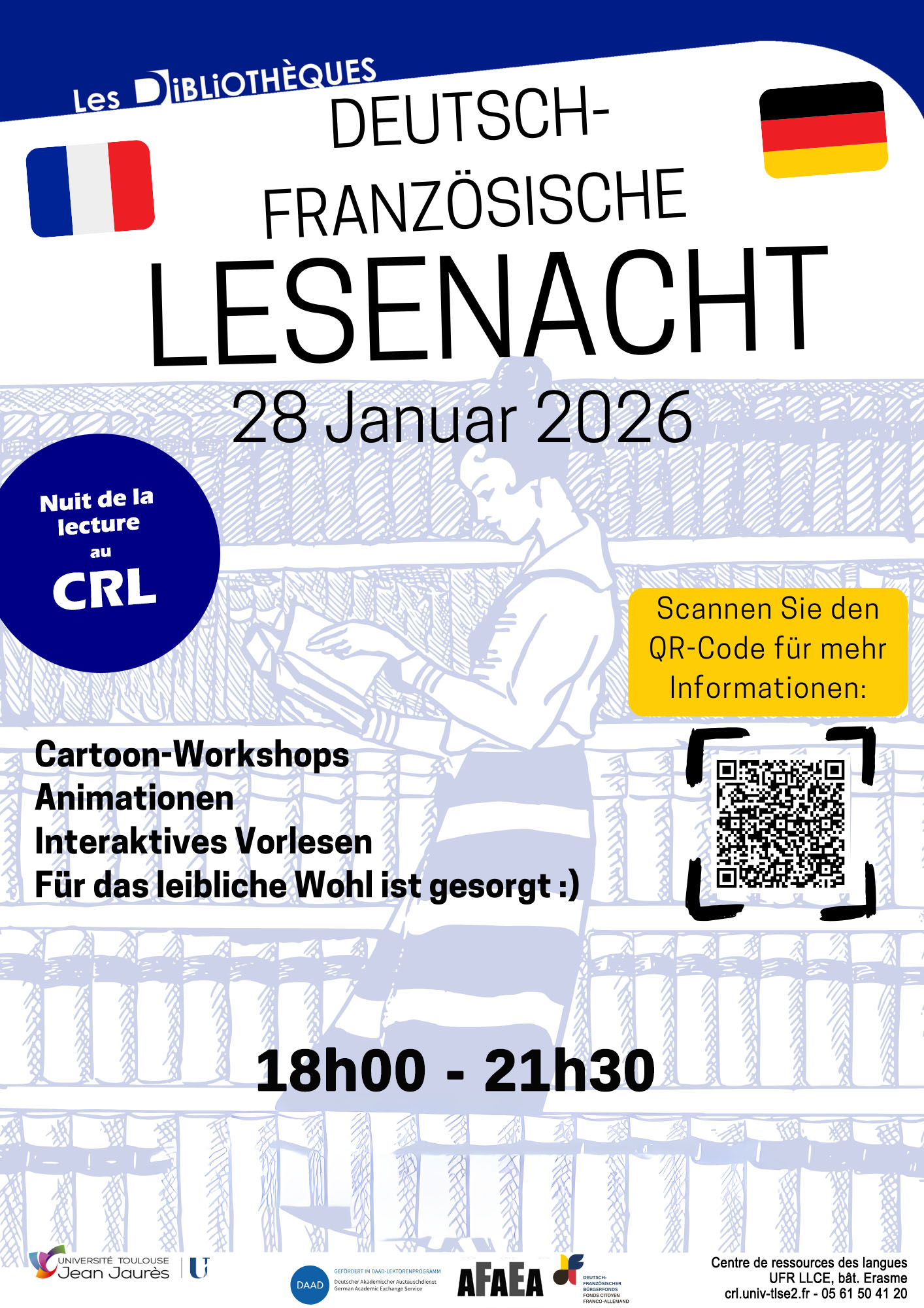 - Un événement sans inscription ouvert à tou·tes pour le plaisir de lire, pour la rencontre entre générations et le partage entre cultures, proposé par la section allemand de l'UT2J, Theresa Heger et Pia Lorenz (DAAD, Office allemand d'échanges universitaires), le Fonds citoyen franco-allemand et l'association franco-allemande d'expression artistique (AFAEA).
