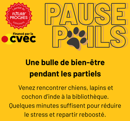 Venez rencontrer nos amis à poils – chiens, lapins et cochons d’Inde – directement à la bibliothèque, dans un espace sécurisé et sécurisant, en présence d'une médiatrice spécialisée. Vous pourrez profiter d'un moment de bien-être et de détente en présence des animaux.
