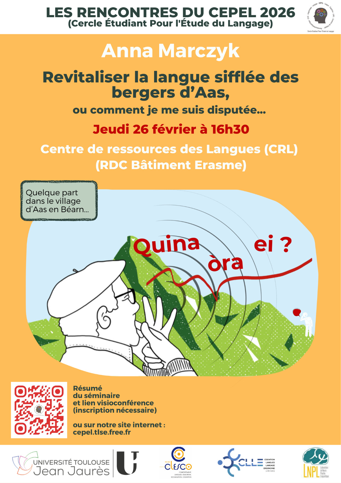 - Le CEPEL, Cercle étudiant pour l'étude du langage, invite avec Anna Marczyk, enseignante à l'UT2J et chercheure au laboratoire de NeuroPsychoLinguistique (NPL) pour un retour d'expérience sur un projet de co-recherche mené avec des partenaires sociétaux, culturels et académique autour de la revitalisation de la langue sifflée des bergers d’Aas.