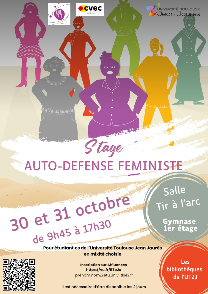 Les Bibliothèques de l’Université Toulouse - Jean Jaurès (UT2J) et l’Association Faire face vous invitent à participer à un stage d’autodéfense féministe pour les étudiant.es (femmes et minorités de genre) de l'UT2J, avec le soutien de la CVEC (Contribution à la Vie Étudiante et de Campus).