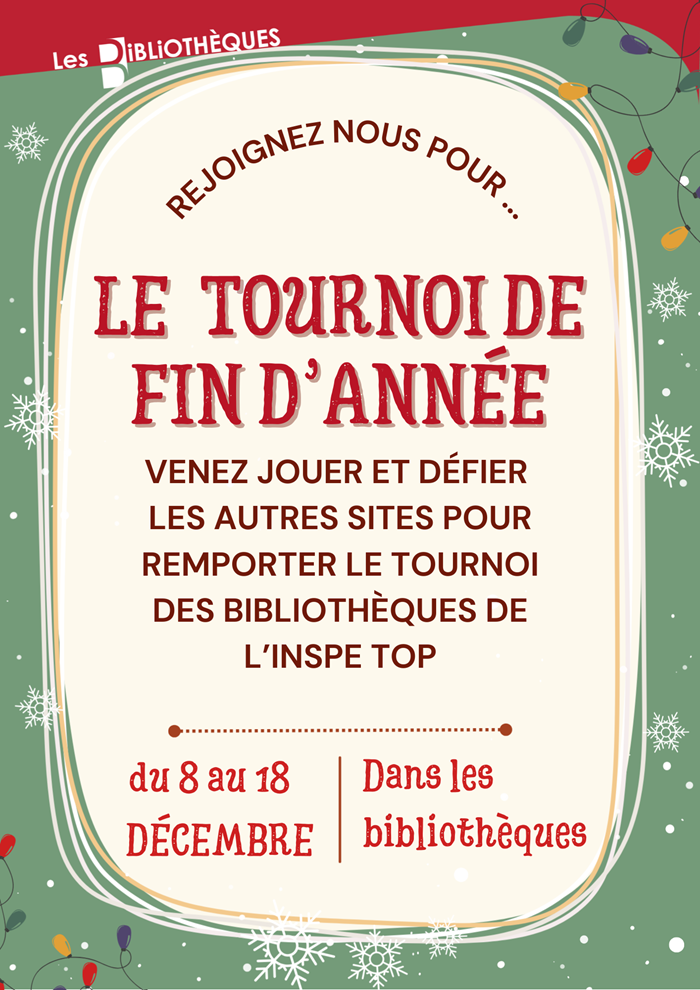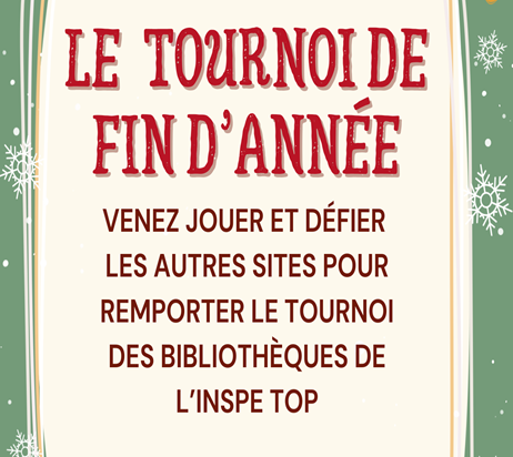 Car l’enjeu est de taille : pas moins de 8 bibliothèques de l’INSPE Toulouse Occitanie-Pyrénées s’affrontent dans ce challenge. Votre participation rapportera des points à votre site. Qui en engrangera le plus et sera déclaré vainqueur du tournoi ? Qui verra son nom gravé dans la lettre d’info des bibliothèques ? Du 8 au 19, mobilisez-vous pour faire gagner votre INSPE, on compte sur vous !