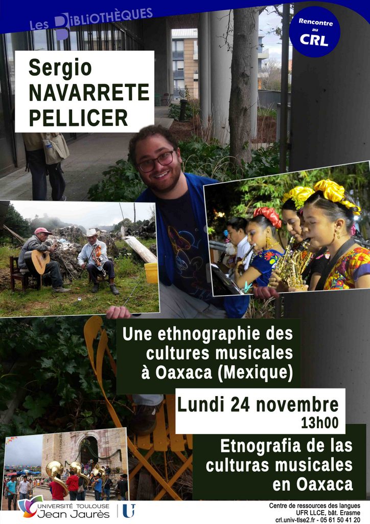 - Sergio Navarrete Pellicer est anthropologue et historien au CIESAS Pacifico Sur (Oaxaca), spécialiste de l'histoire sociale et politique des musiques dans les Amériques, au Mexique et au Guatemala vient présenter "une ethnographie des cultures musicales à Oaxaca (Mexique)" (Etnografia de las culturas musicales en Oaxaca)